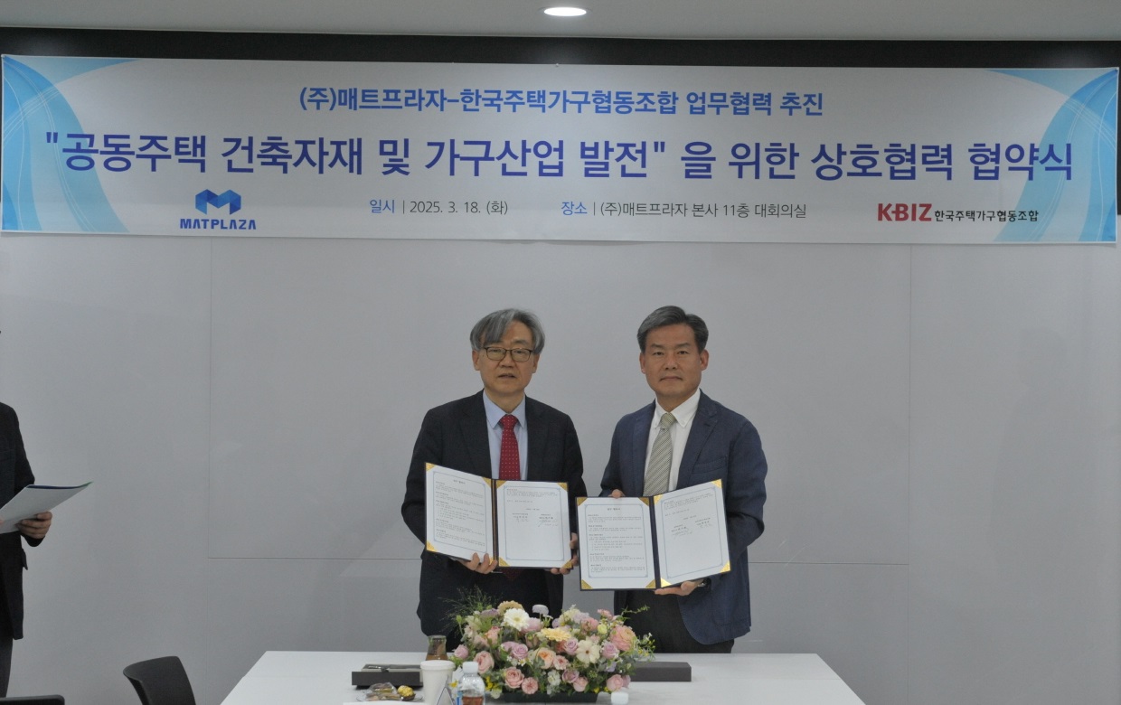 한국주택가구협동조합(이사장 박성진)은 2025년 3월 18일, 매트프라자㈜(대표이사 하기룡)와 업무협약을 체결하고, 상호 협력을 통한 공동 발전과 기술 협력 강화에 나섰다.