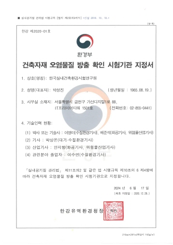 환경부 건축자재 오염물질 방출 확인 시험기관 지정서
