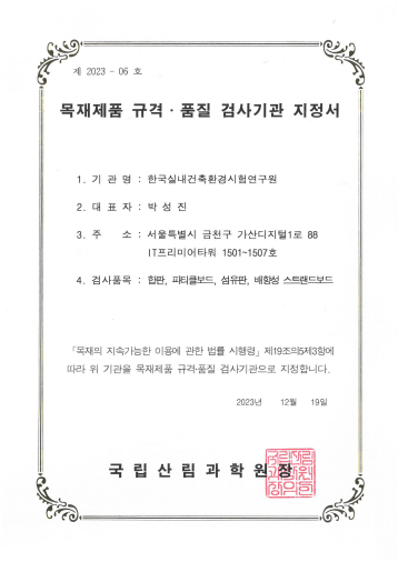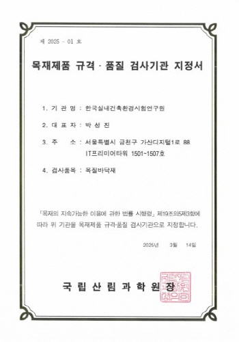 목재제품 규격·품질 검사기관 지정서